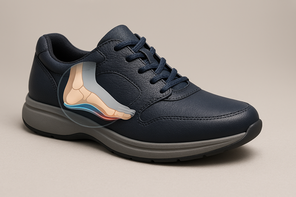 Alt text: Orthopaedic shoe in navy color with arch support and heel cushioning illustration, designed for walking and standing all day.